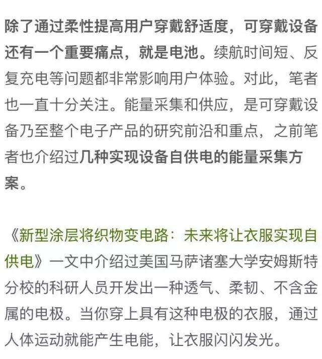 《新型纺织品利用太阳能和风能为可穿戴电子产品供电》一文中介绍过美国乔治亚理工学院的研究人员开发出一种新型纺织品,它结合了两种电能产生方式:将太阳能或者动能转化为电能。除了利用太阳能,其中还设计到一个重要原理:摩擦起电效应,即通过旋转、滑动、振动等物理运动所引起的摩擦起电效应产生电能。