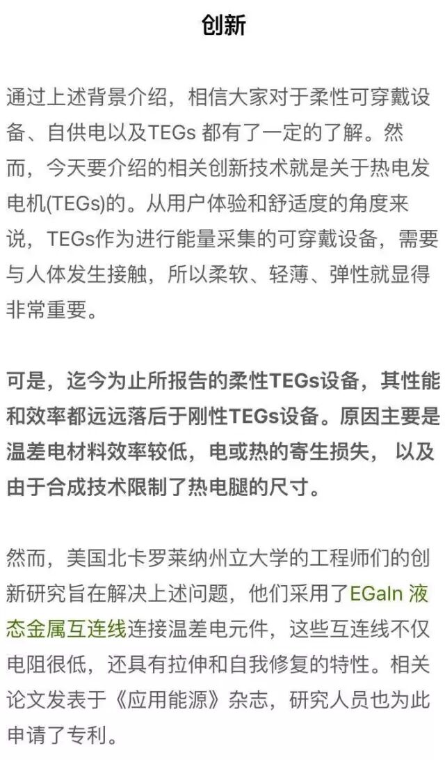 柔性和自供电,是目前可穿戴设备的技术前沿和发展方向。最近,美国北卡罗莱纳州立大学的研究人员为了提高柔性可穿戴设备中热电发电机的性能和效率,采用EGaIn 液态金属互连线连接温差电元件,这些互连线不仅电阻很低,还具有拉伸和自我修复的特性。