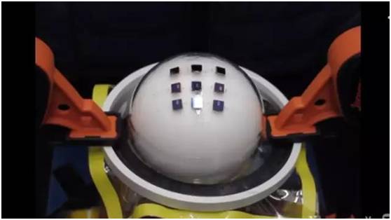 鲍哲南团队在测试这种材料的弹性,用这种材料往机器人测试仪器的球面上逐渐下压,从图中可以这种材料弹性很高,而且几乎是透明的