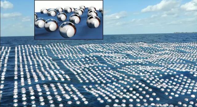 蓝色能源梦想的艺术概念图:网状联结数以百万计的可捕获低频海波能量的摩擦纳米发电机。小图是设计的球形纳米发电机。
