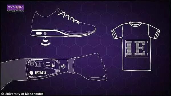 开发一个可以弯曲和弯曲的电池是智能服装的关键一步,可以读取生命体征(左下角),在T恤上展示一个图案logo(右侧),或者在跑步过程中读取步速(左上角)