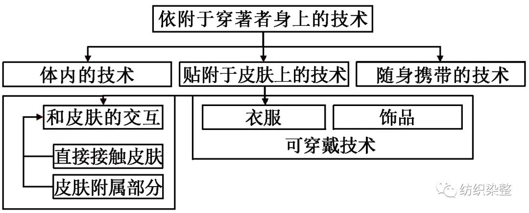 可穿戴技术将不再局限于可配戴的服装装饰,而应该作为穿戴者日常穿着衣服的保护层的一部分,感知周围环境的一部分,湿热环境管理系统的一部分,甚至是身体免疫系统衍生的一部分,即无障碍的人和技术之间的交互;同时,可穿戴设备也需重新思考其科学技术与时尚融合的特点,达到多功能性、舒适性、时尚性3方面的平衡,这种平衡也直接决定着是否能赢得消费者的青睐。考虑穿戴者2种不同佩戴可穿戴技术的方式:随身携带式和贴附于皮肤2种方式,其产品特点和种类如图3所示。