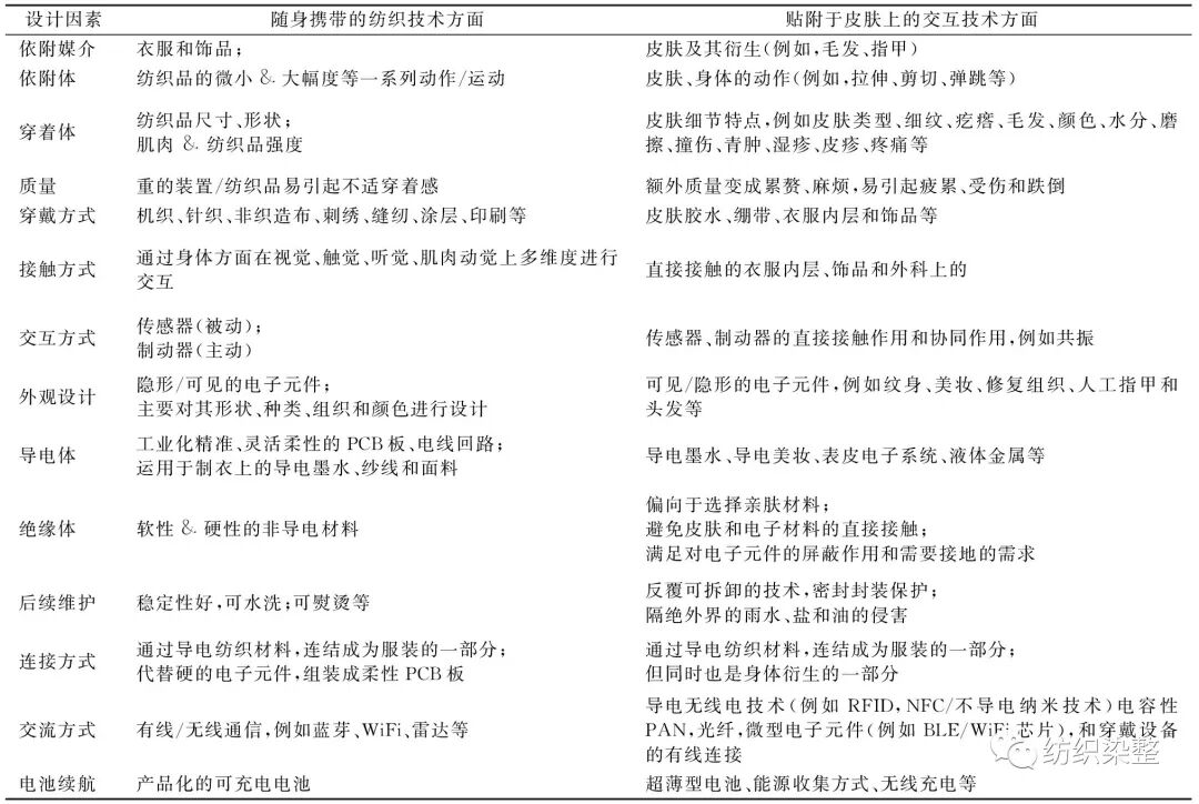 为了更好地了解互动,多方人士正在探究这种柔性可穿戴技术中的技术元素:人与人之间的距离、执行语言、人体肢体动作、身体尺寸、依附穿著者的方式、依附位置、依附质量、和电子元件的互动方式、外观设计、耐用性,和它们相互之间的联系与制约。对于运用于服装和饰品设计上的柔性可穿戴技术,这种舒适的可穿性存在于此种功能服装的设计、保温透湿性能、移动性能、灵活性、耐穿性、尺寸和后期护理中。而用于直接贴附皮肤的柔性可穿戴技术,则主要考虑的因素是各个项目的实施部位和其人体工程学、设备材料、皮肤的兼容性、设备类型、设备的能源和信号的输入以及信息的输出、技术和人体之间的交互和信息处理方式等。表2示出柔性可穿戴纺织技术与穿着者交互之间的设计因素