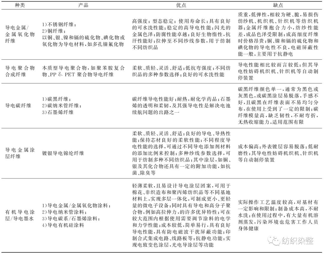 柔性导电纺织材料是智慧衣发展的重要基础技术,由导电纤维打造而成的导电纺织品,其技术限制点在于电性(电阻、电容等),而导电纺织品的表面电阻特性取决于所用的导电材料或导电纤维的百分比、所成织物结构以及制造方法等因素。纵观近年来在学界和业界取得的成果,依据原材料和导电性能的不同,将柔性导电纺织材料进行分类,如表1所示。