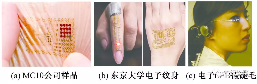 (a) MC10 conductive tattoo sample;(b) Conductive tattoo sample of University of Tokyo; (c) Electric LED false eyelashes