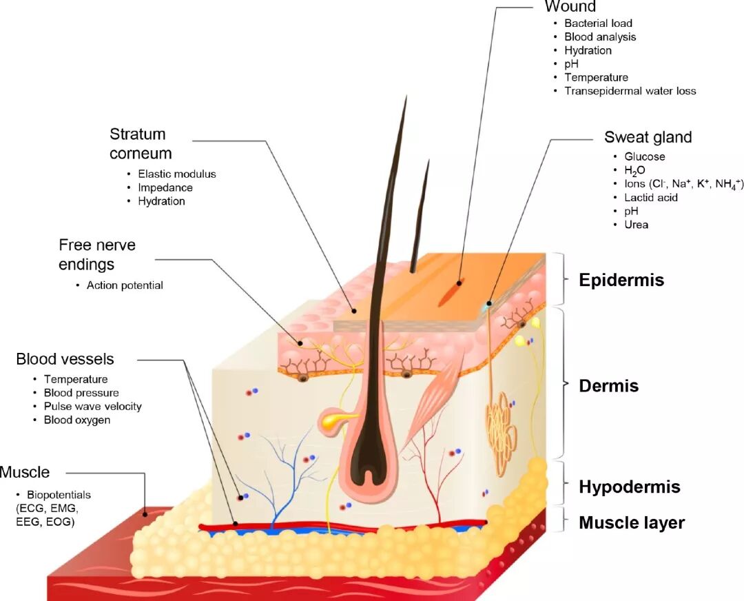 皮肤作为诊断平台,其诊断信号来自肌肉、血管、游离神经末梢、角质层、伤口和汗腺等。
