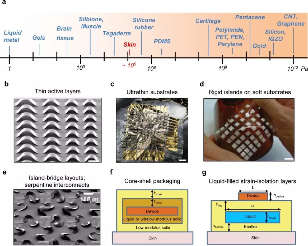 可穿戴式医疗电子的商业应用取决于其所使用的设计、结构和材料,但从根本上这些都是刚性和笨重的。现有的系统为临床应用提供了强大而可靠的功能,但是它们繁琐的布线和与皮肤的不良集成阻碍了移动、舒适和连续的长期精确监测。 尽管集成电路的性能和小型化取得了进步,但可穿戴技术中的机械设计依然概念陈旧:使用脆性元件,或封装在刚性封装中,导致很多需要带子或胶带的大型装置作为医疗监控设备用于疾病临床评估中。