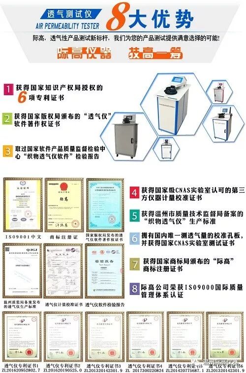目前常用于透气性测试的标准有:ASTM D737《纺织品透气性测试方法》,ISO 9237《纺织品织物透气性测试方法》,GB/T 5453《纺织品织物透气性的测试》和JIS L1096《纺织品透气性测试方法》。