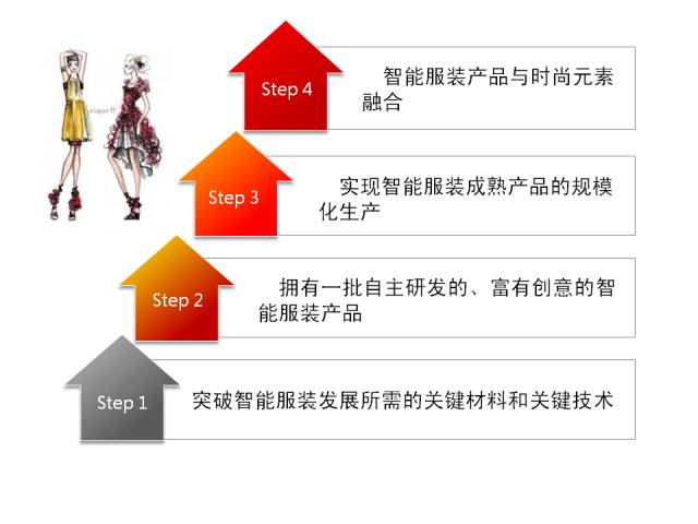 智能服装的发展有四个重要阶段:第一,关键技术、材料的突破;第二,关键单元、产品的自主研发;第三,低成本的、绿色的规模化生产;最后,个性化设计满足消费需求。