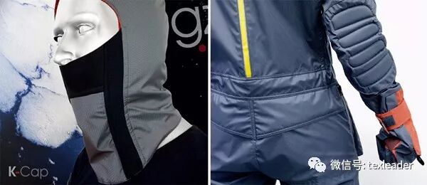 GradoZero Espace公司基于形状记忆材料开发的巴拉克拉法帽K-Cap可以为高海拔登山者提供智能防护。K-Cap由两层针织物组成,其中内层采用了形状记忆材料,可以在温度降低时适应穿戴者头部和面部轮廓收紧,外层织物由两层高弹力的纱线织成,可允许和随着穿戴者头部自由转动而不影响其视线。Grado Zero Espace还将这种形状记忆材料用于其S1帆船运动服上,可根据穿戴者身体发热和出汗情况调节服装的渗透性和透气性。另外该服装还在特殊部位采用了由粘弹性聚氨酯记忆泡沫制成的冲击吸收垫和电致发光膜材料,可提供防冲击和在黑暗情况下的高可见防护。