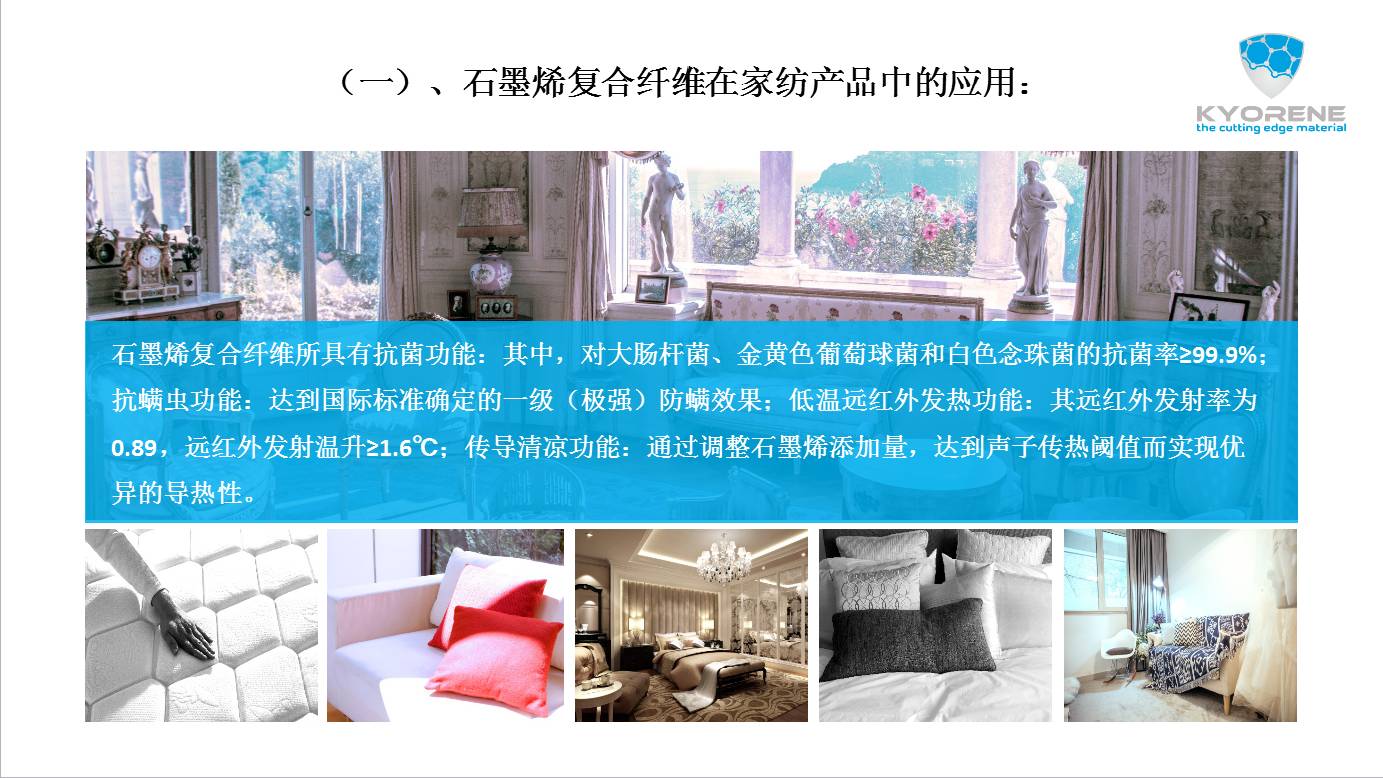 石墨烯复合纤维所具有抗菌功能:其中,对大肠杆菌、金黄色葡萄球菌和白色念珠菌的抗菌率39.9%;抗螨虫功能:达到国际标准确定的一级(极强)防螨效果;低温远红外发热功能:炫达红外发射率为0.89,远紅外发射温升≥1.61℃;传导消凉功能:通过调整石墨烯添加量,达到声子传热阈值而实现优异的导热性。这些特殊功能,尤其适用在床单、被套、毛毯、毛巾被、枕头、枕套等床上用品以及床垫、座垫、沙发、窗帘、地毯、桌布、壁纸等家居和家装产品上。