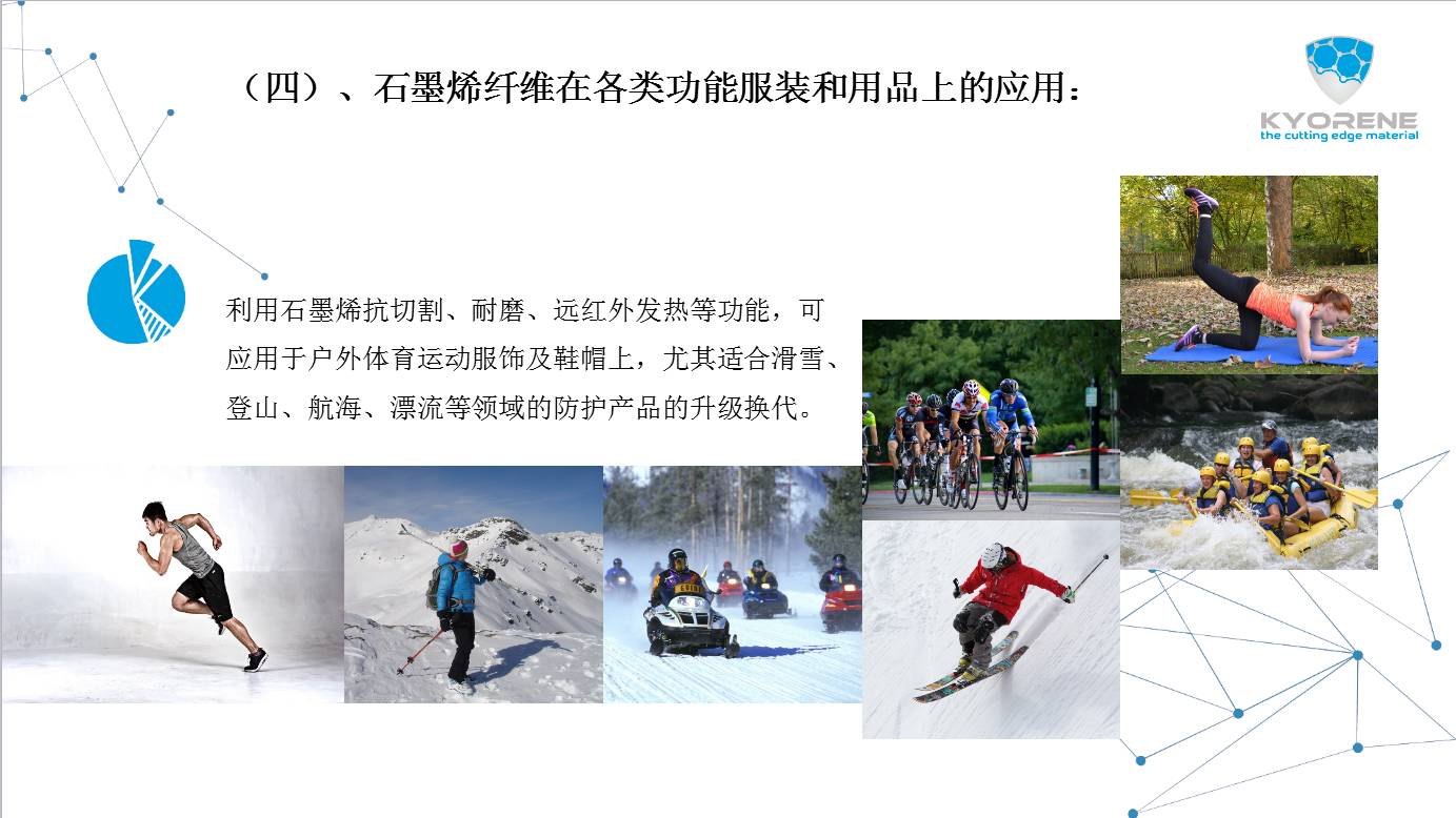 利用石墨烯抗切割、耐磨、远红外发热等功能,可应用于户外体育运动服饰及鞋帽上,尤其适合滑雪、登山等领域的防护产品的升级换代。石 墨烯独特的单原子层二维纳米晶体结构,对高能紫外线的吸收效率高、屏蔽效果理想,从而表现出非凡的抗紫外线性能。利用石墨烯抗紫外线的优异功能,可制造抗紫外帐篷、遮阳伞和抗紫外服装等产品。