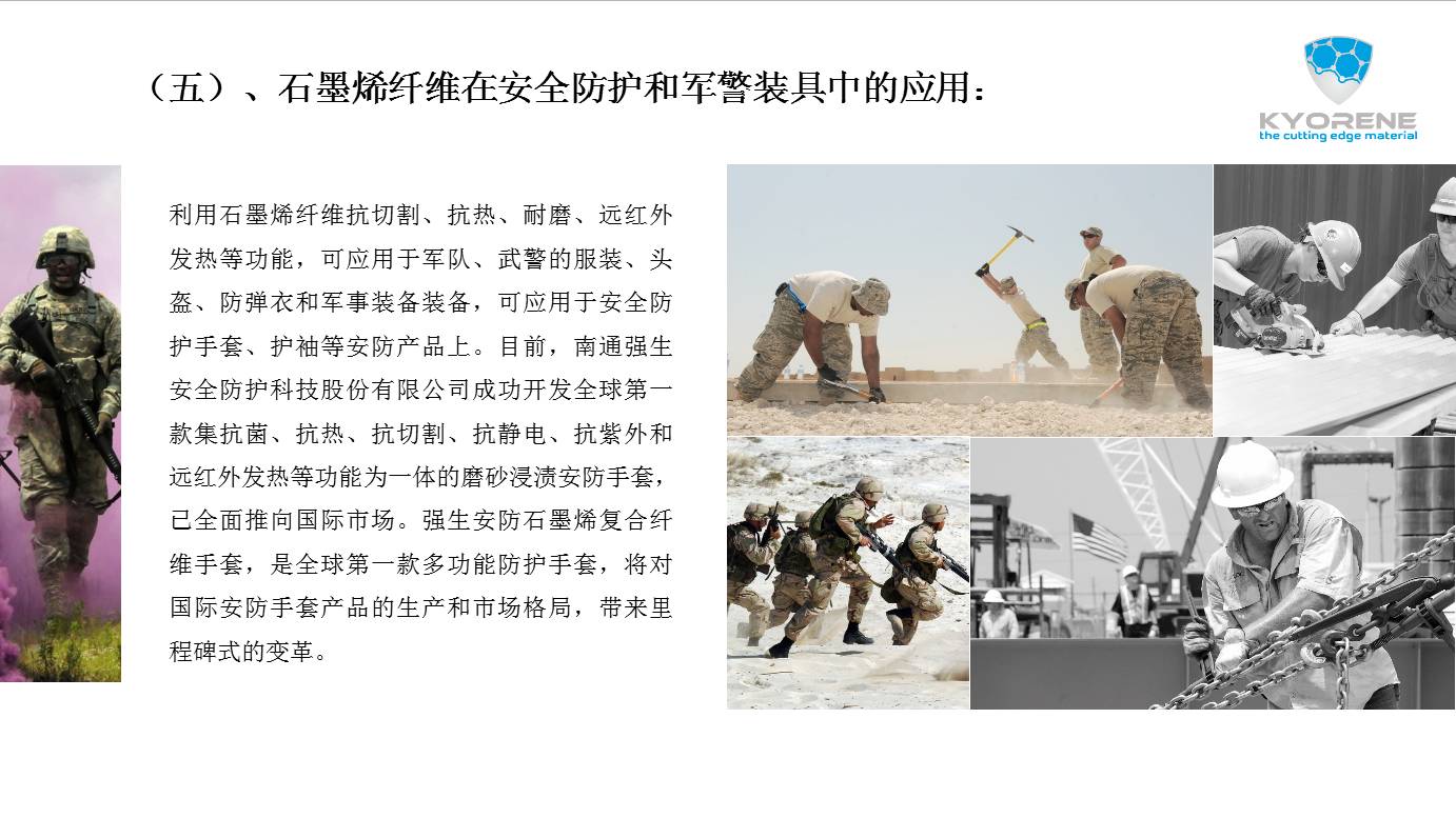 利用石墨烯纤维抗切割、抗冲击、抗热、耐磨、远红外发热等功能, 可应用于军队、武警的服装、头盔、防弹衣和军事装备装备,可应用于安 全防护手套、护袖等安防产品上。目前,南通强生安全防护科技股份有限 公司成功开发全球第一款集抗菌、抗热、抗切割、抗静电、抗紫外和远红 外发热等功能为一体的磨砂浸渍安防手套,己全面推向国际市场。强生安 防石墨烯复合纤维手套,是全球第一款多功能防护手套。