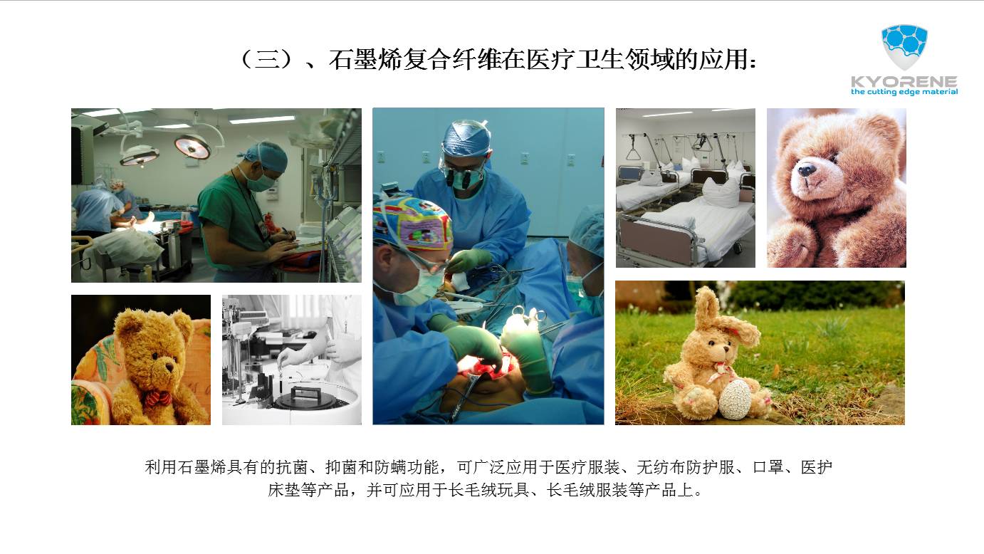 利用石墨烯具有的抗菌、抑菌和防螨功能,可广泛应用于医疗服装、 无纺布防护服、口罩、医护床垫等产品,并可应用于长毛绒玩具、长毛绒服装等产品上。螨虫潜伏在床垫、枕头、被子、座垫、玩具和地毯里,是诱发过敏性鼻炎、喉头水肿、哮喘和湿殄等疾病的重要原因,调查显示全球16亿人患有过敏性炎。