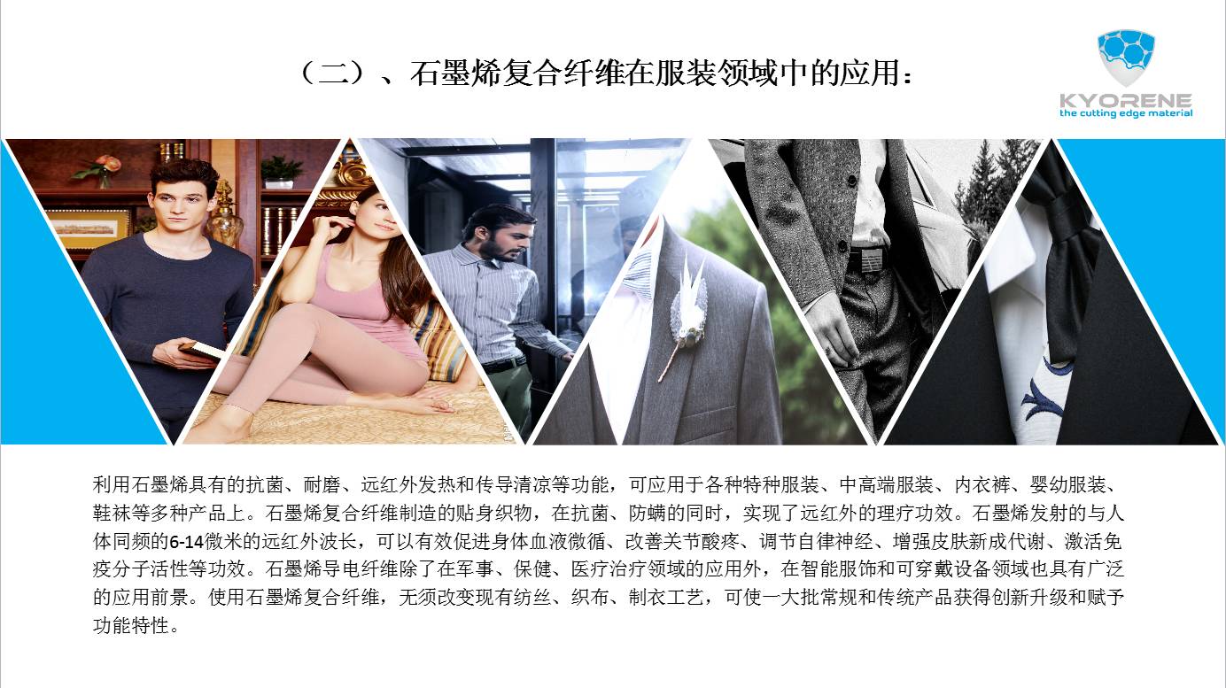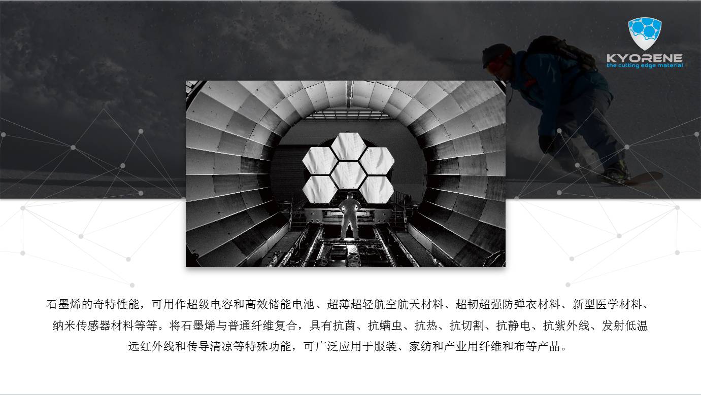 将石墨烯与普通纤维复合,具有抗菌、抗螨虫、抗热、抗切割、抗静电、抗紫外线和远红外发热、传导清凉等多项功能,可应用于各种中高端纺织产品。