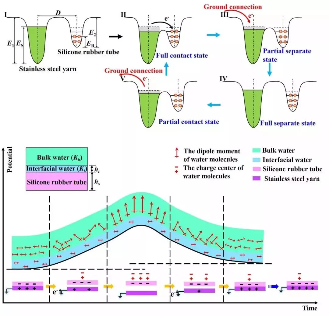 为深入探讨纱线的发电机理,研究人员研究了金属与非晶聚合物接触/分离的单电极势阱模型,发现非晶聚合物不仅作为隔离层防止纱线内场电势被外界环境气氛消除,其界面的感应电荷竟还能与外界气氛分子发生耦合增益,由此首次提出了摩擦发电器件的电势/极化耦合效应的假设。